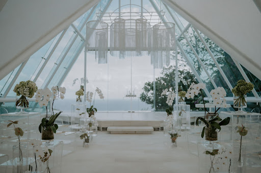 ![Tirtha Uluwatu’s Glass Chapel as a wedding ceremony venue in the Eve package, with floral aisle decor and ghost chairs.]()